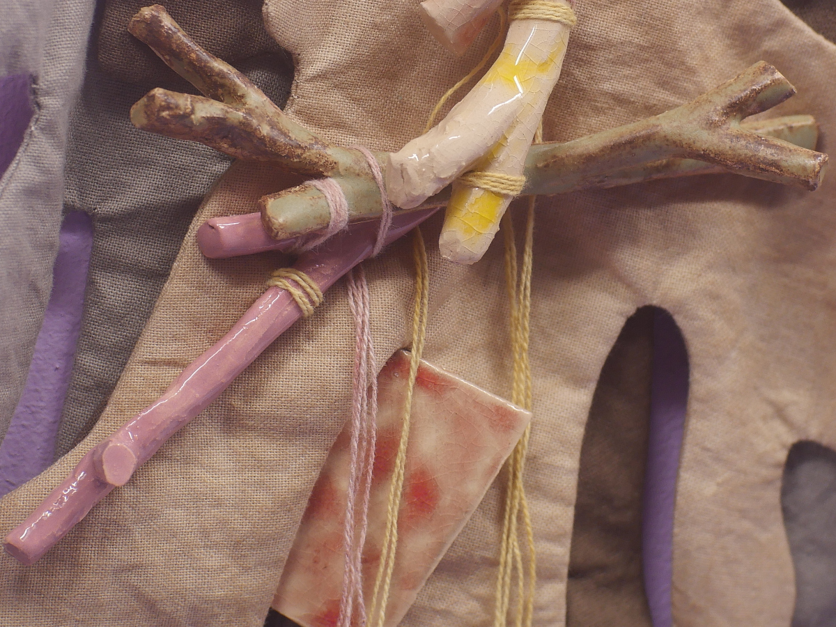 Tissus teints aux algues et plantes dunaires, céramique émaillée, fils de coton teint (Casa Proal). 50×30 cm.
