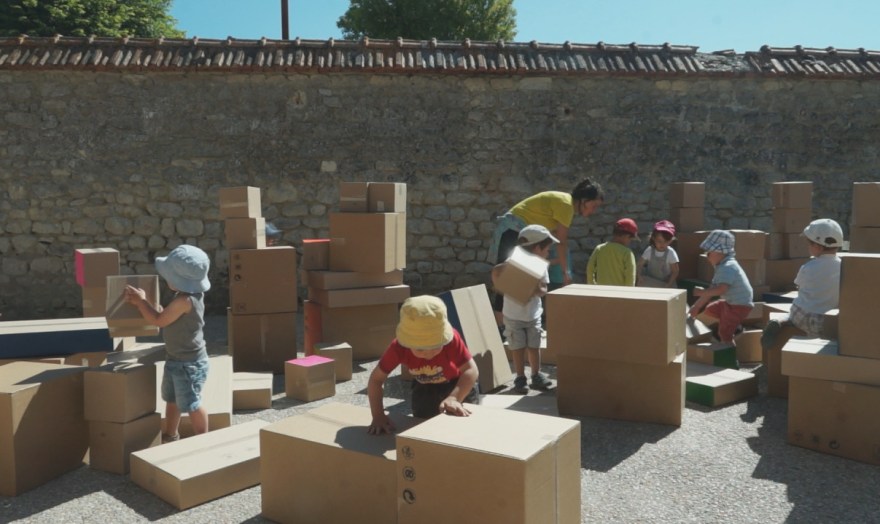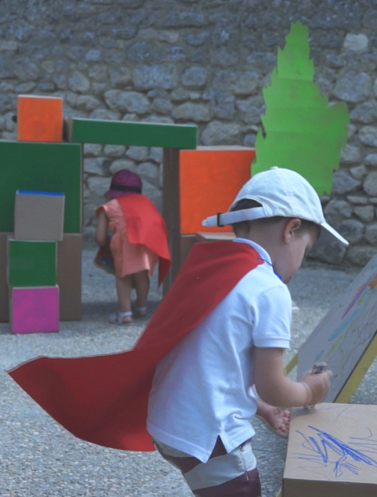 Bois, cartons, peintures, craies, capes. Atelier d’une semaine avec des enfants de 2 à 3 ans. L’occupation d’un même espace devient le théâtre de différentes fabrications, construisant un paysage transformé jour après jour.