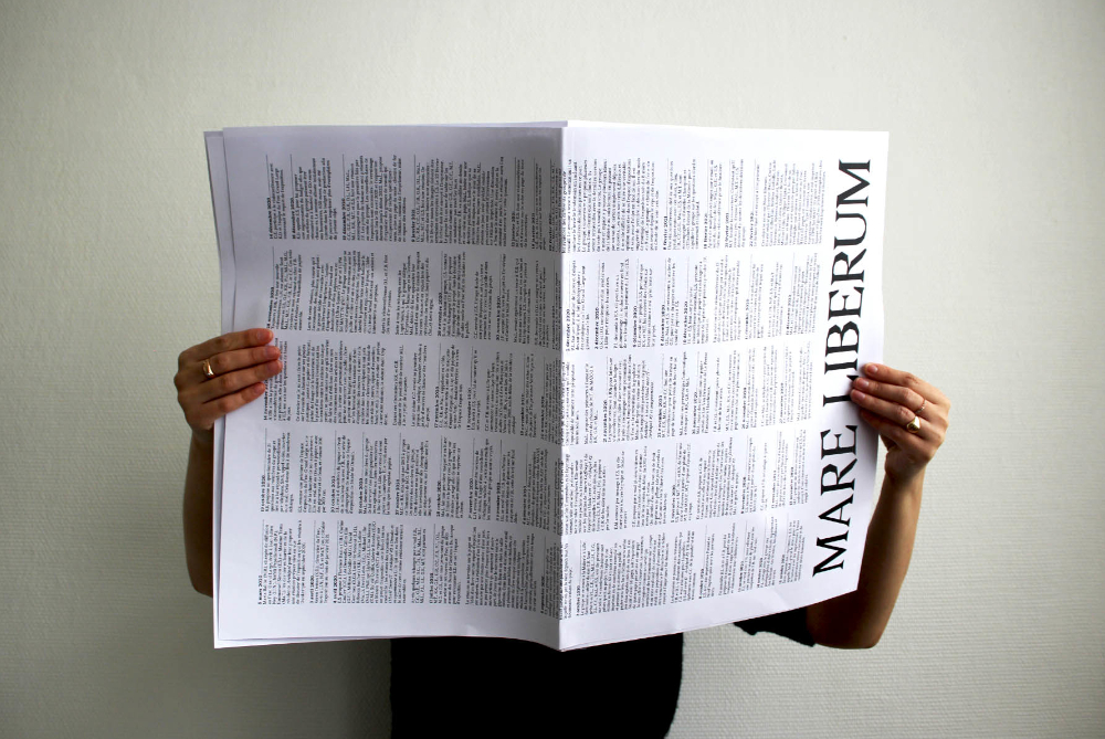 Mare Liberum est un objet hybride, un mélange non défini entre un espace d’exposition, une œuvre collective, une édition, un fanzine, un catalogue d’exposition… Il contient des projets aux ramifications plus ou moins grandes, passant d’œuvres réalisées par une seule personne à des projets comprenant trois, quatre voire cinq artistes. Ces différentes collaborations se matérialisent par des appropriations, des copies et des collages. Il questionne à la fois l’espace d’exposition et celui de la page. Mare Liberum mêle sans distinction quatorze artistes, amateur·es, étudiantes et professionnel·les, et a été exposé à la fois dans un lieu institutionnel, le Frac Grand Large à Dunkerque, et dans un espace d’exposition privé, 46m² à Lille. Ce qui traduit deux notions chères aux membres du groupe : la déhirarchisation et la remise en cause des statuts.