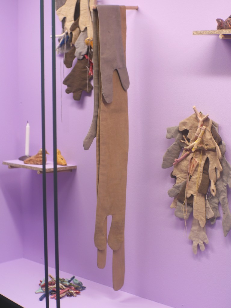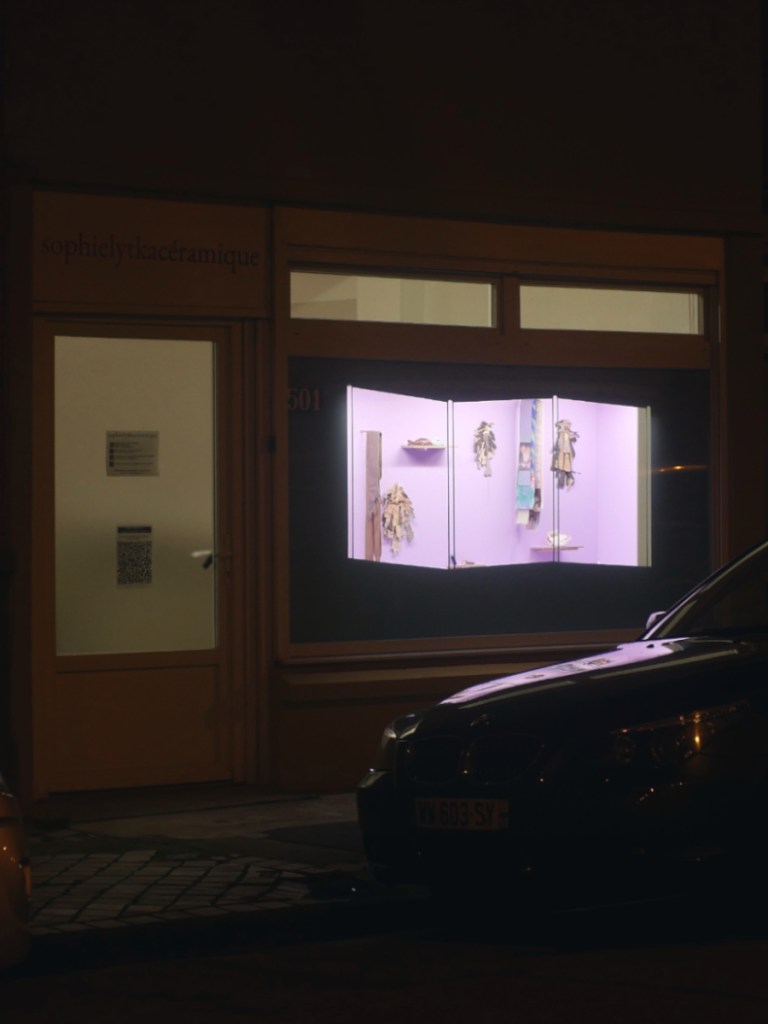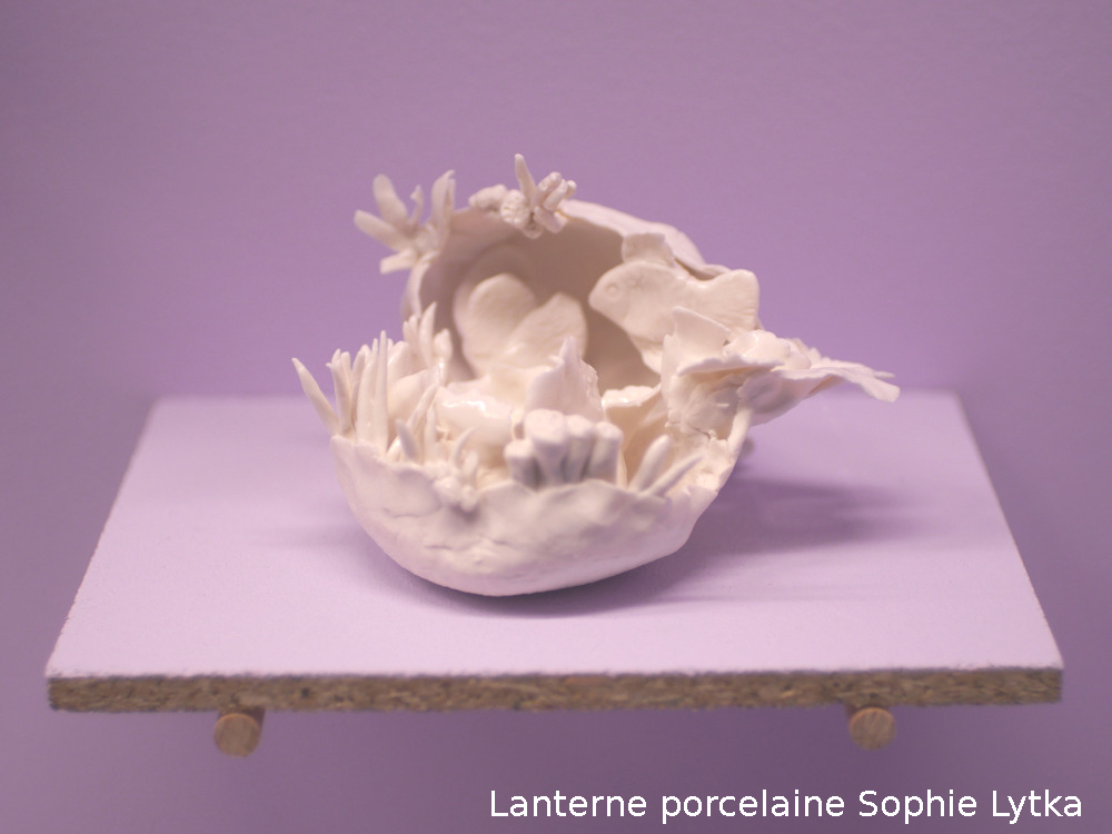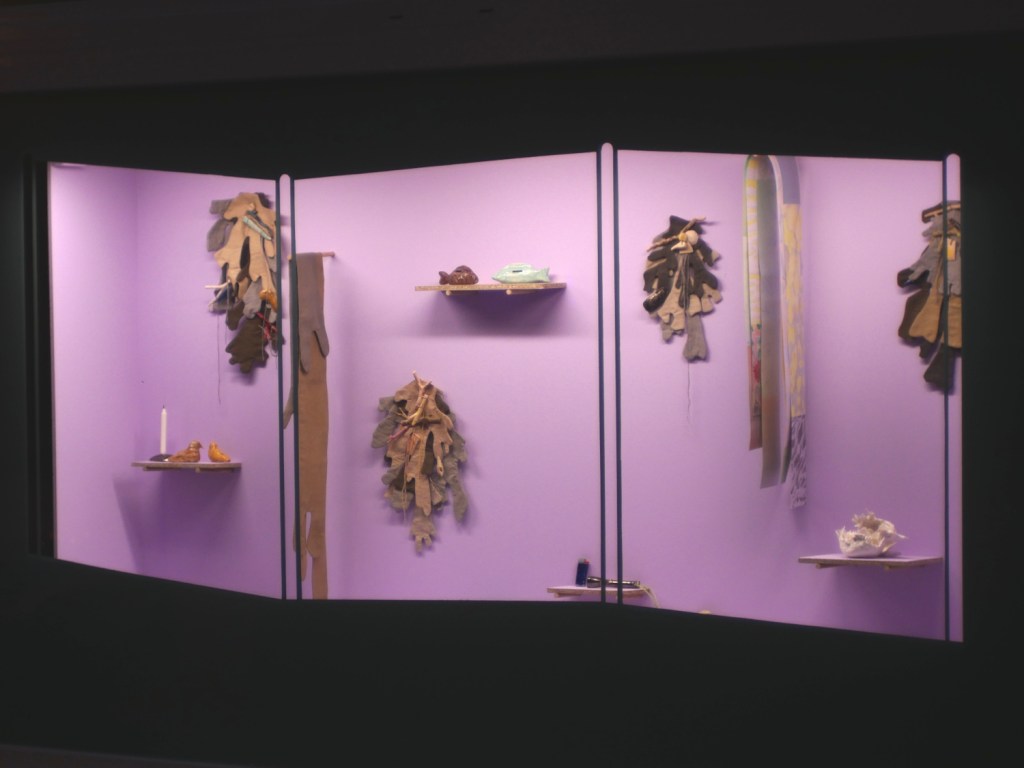 Vitrine, caisson, peinture, éclairages. Tissus teints aux algues et plantes dunaires. Céramiques émaillées. Editions.