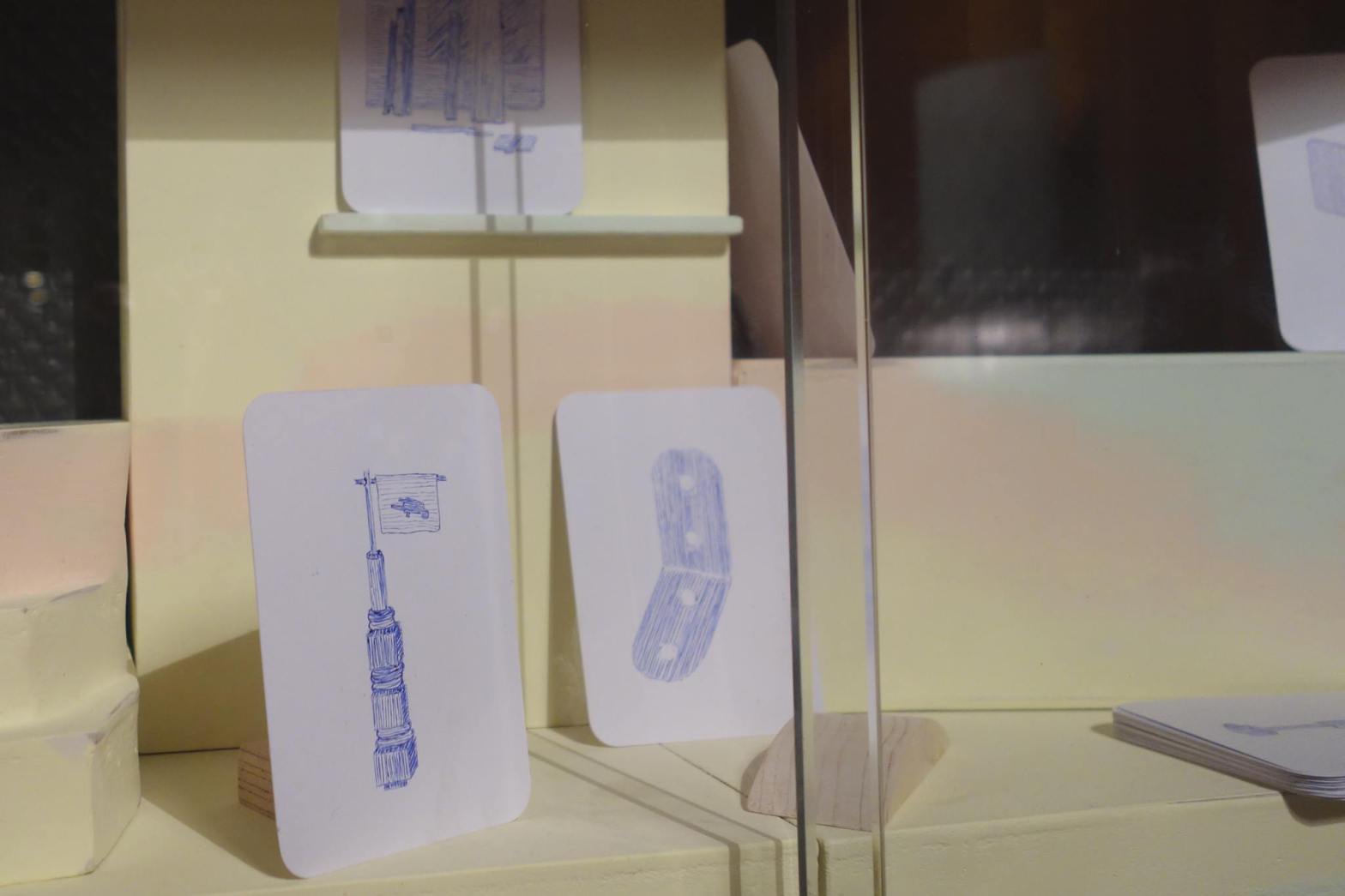 Installation in situ. Bois, peinture, dessins au bic. Entre rampe de skate, présentoir, décor d’aquarium et projet d’architecture, le podium accueille une cinquantaine de dessins au format carte à jouer, représentant des éléments de notre production artistique. L’ensemble renvoie à une partie de belote suspendue, proposant une certaine combinaison de signes biographiques de Galerie Rezeda. Soft est un projet curatorial de Anne-Émilie PHILIPPE: Soft, c’est une vitrine d’artiste. Chaque dernier mercredi du mois, la vitrine du bar lillois « le Verlaine » accueil une proposition d’artiste.