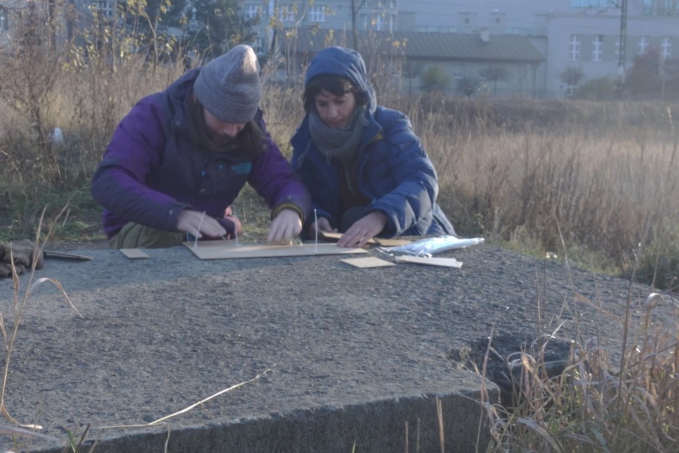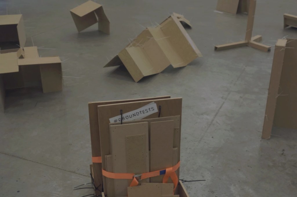 Le répertoire d’éléments disposés sur le sol d’exposition semble évoquer un prototype d’aire de jeux dont les matériaux de construction pauvres et leurs techniques d’assemblage (colliers de serrage en nylon) dévoilent la précarité de l’installation. Chaque élément est un moule d’une partie d’architecture, samplée dans le voisinage urbain du lieu d’exposition. Des vidéos disponibles sur le web retracent le processus de moulage: #groundtests . On nous y voit effectuer des marches dans le quartier pour y choisir les fragments d’architecture (mur, escalier, palissade, panneau de signalisation ,etc…) que l’on veut prélever. Des plaques de bois pré-découpées et percées, aux formes et dimensions variées, sont assemblées et agencées afin de recouvrir la zone choisie. Fixées avec des colliers de serrage, les plaques dupliquent la forme d’architecture. Chaque sample est ensuite ramené à au lieu d’exposition. Ground Test Facilities est ainsi un condensé de l’architecture environnante, une trace de nos actions et de notre expérience dans un territoire.